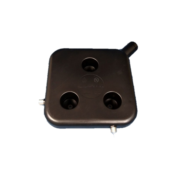 The tank is attached to a vertical wall (typically the outer wall of a cabin or passenger compartment) via the three holes on the back. The installation can take place by protruding the loading nozzle to the right or left, indifferently; for this purpose, the tank is equipped with two interchangeable fittings. The tank is built of high-density polythylene (HDPE). The gasket on the fittings are made of Viton, the sealing gasket of the filling cap is made of NBR. In both versions, a nylon filter is installed on the liquid outlet fitting or faucet