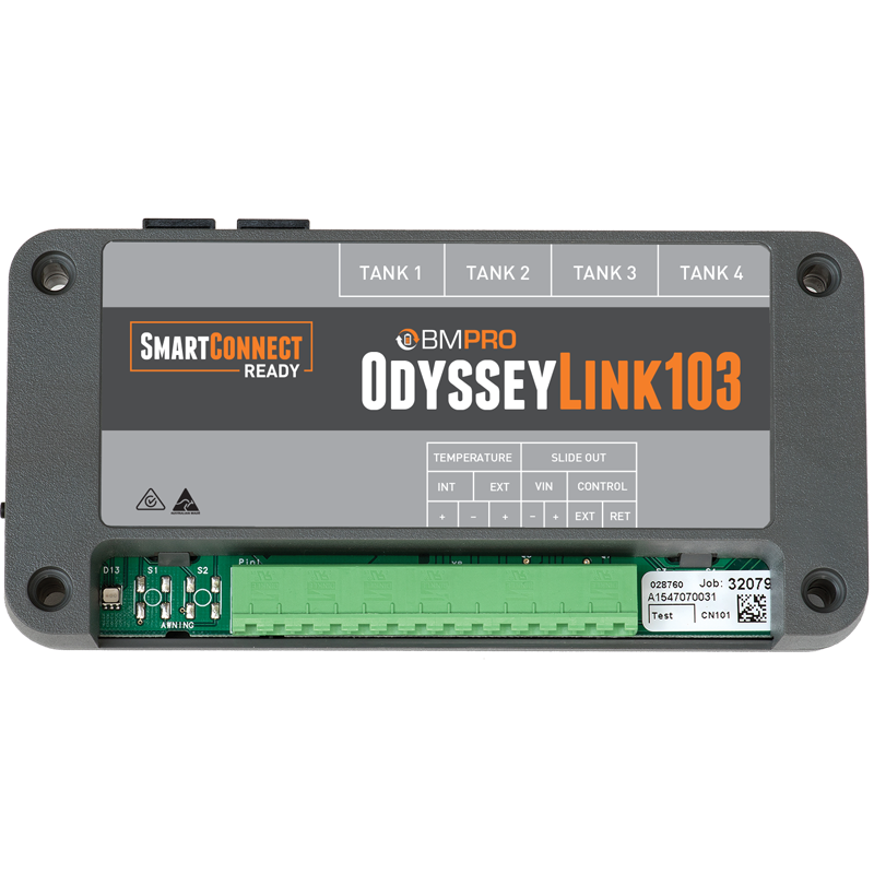 OdysseyLink103 is a communication centre for smart RV systems, such as Odyssey and SmartConnect. It communicates wirelessly and via CAN bus, connecting your vehicle’s power management system to the monitor, display or an app.