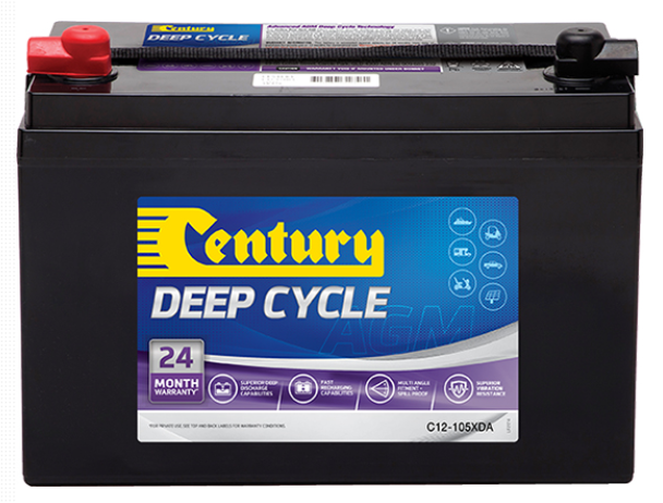 Century 12V 105Ah AGM Deep Cycle Battery, C12-105XDA, 2 Year Warranty. Century AGM Deep Cycle Batteries are the ultimate in deep cycle battery performance, designed to provide longer life and dependable deep cycling capability in the harshest of operating conditions and environments.