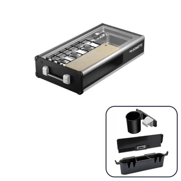 Not only does the Dometic Slide Out Kitchen save valuable space, but its telescopic runners also make it quick and easy to pull-out and stow away after use. It provides all the kitchen essentials: a sink, double-side access storage, three-burner cooktop, and a chopping board. Various additional features can be added such as a bottle opener, cup and utensil holders.