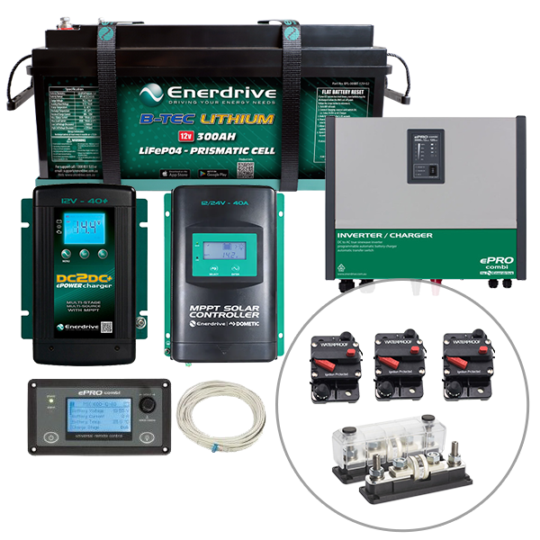 Enerdrive 300Ah Caravan 3000W Inverter Charger Bundle, 5 Year Warranty. The Enerdrive 300Ah lithium battery, when used in combination with a 40A DC-to-DC charger, is typically part of a setup commonly used in various applications, including off-grid power systems, recreational vehicles (RVs), boats, and other mobile power needs.