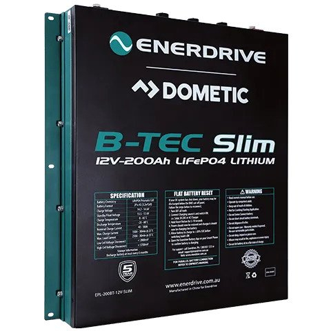 Enerdrive B-TEC 200Ah Slim Metal Case Lithium Battery, 5 Year Warranty. The new 200Ah ePOWER B-TEC Slimline lithium battery is designed and intended for use in deep cycle applications where a single battery is required that meets the amp hour capacity.