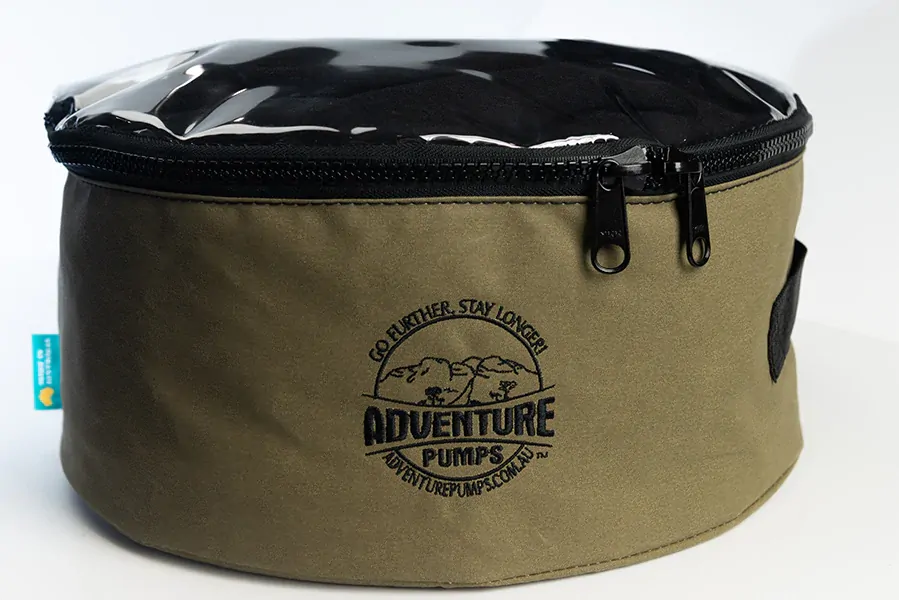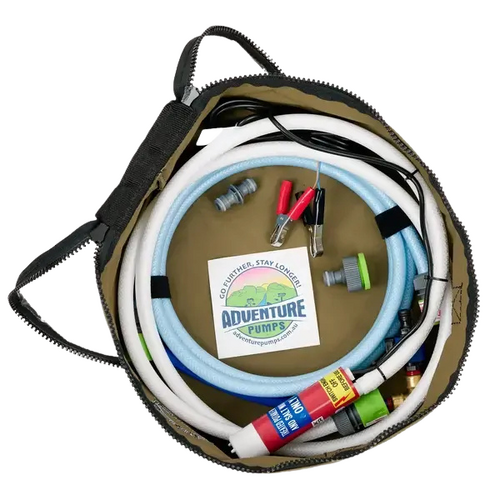Adventure Pumps Bundle with Bag and Alligator Clamps, 1 Year Warranty. Everything you need for quick, hassle-free water transfers on the go, water transfer pump kit and accessories neatly secured in an Australian made Canvas bag.This bundle is durable, uses low power, has a slimline design and reduces effort water transfer.