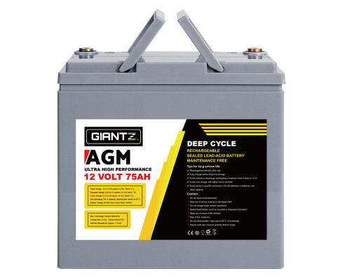 Giantz 12V 75Ah AGM Deep Cycle Battery, 1 Year Warranty.  Our portable GIANTZ Deep Cycle Battery provides off-the-grid power supply for 4WD vehicles, caravans, campers, trailers, motorhomes, saltwater/marine applications, and all 12V appliances including portable fridges and washers. The 75Ah 12V battery features an incredible cycle life of up to 1400 cycles, making it one of the most enduring in its class. What you get is a longer, consistent and more drawn out charge all the time. And with its advanced AGM technology, the battery enables better electrolyte absorption, cyclic stability and frequent charging without affecting performance. The bolt down terminals also allows for more reliable experience, and not least, the high oxygen-recombination efficiency results in superior deep discharge recovery. The maintenance-free deep cycle battery is completely sealed, spill-proof and does not leak gas for added safety and durable use.