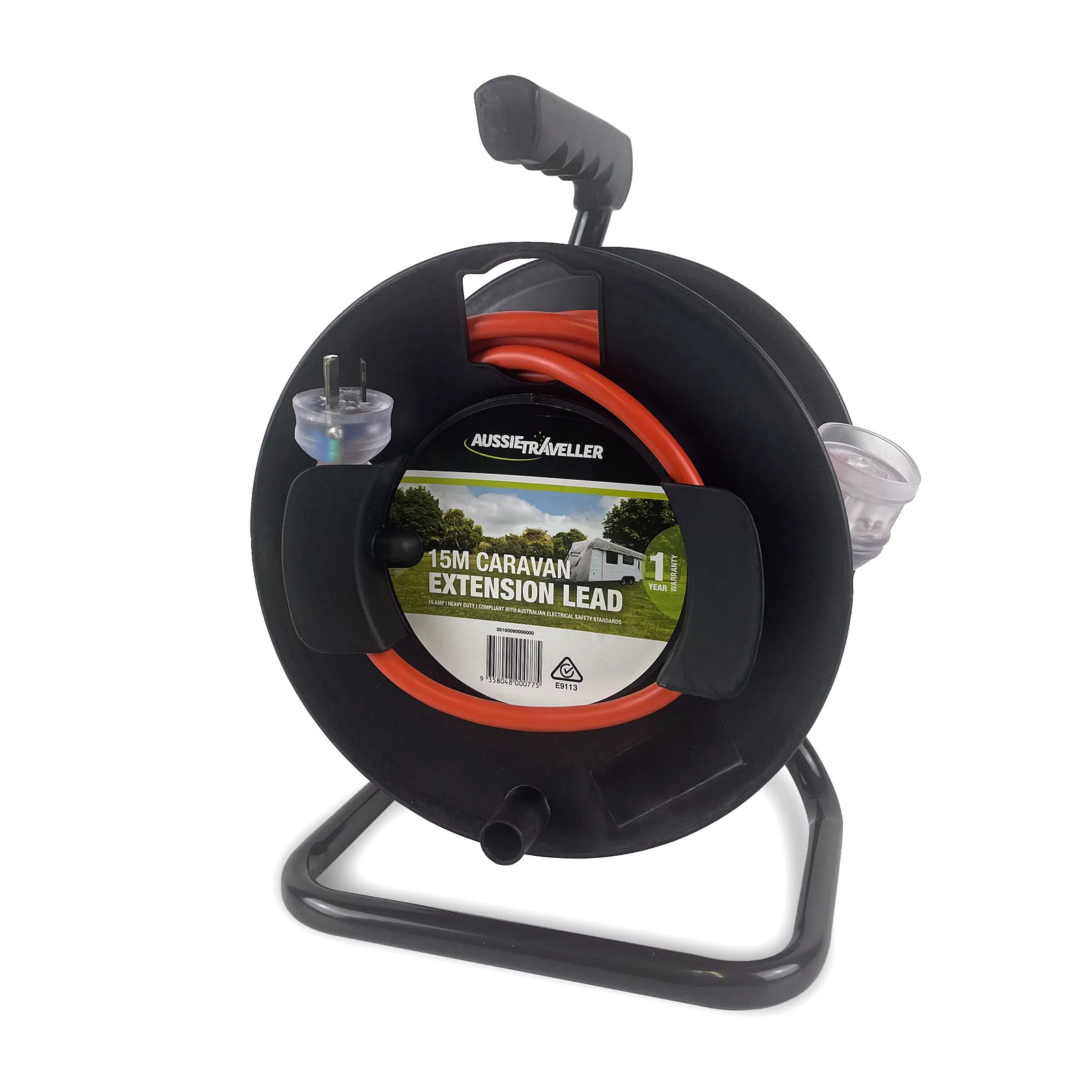 Aussie Traveller 15m Extension Lead on Reel - 15Amp, 1 Year Warranty. The Extension Reel is a compact and practical solution for keeping your caravan cable lead stored neatly. This heavy duty 15 metre extension lead provides 15Amp power and is fully rated and compliant with Australian Electrical Safety Standards. Our reel is a must for keeping your caravan organised.