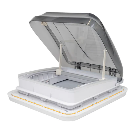 Aussie Traveller 400x400 Roof Hatch with Smoke Black Lid, 1 Year Warranty. The European style of Fruecamp Roof Hatches are an essential component for any Caravan or RV to ensure sufficient ventilation. The unique and high quality design of the 400 x 400mm Skylight Hatch is ideal for your Caravan or RV living area, providing comfortable air flow and perfect lighting.