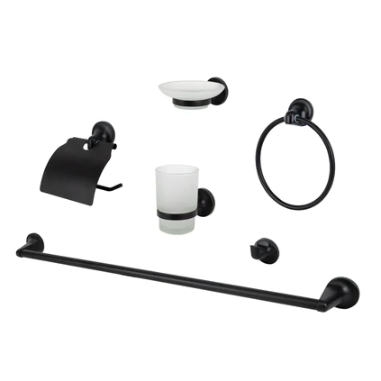 Aussie Traveller Black Bathroom Accessories Set, 1 Year Warranty. The Aussie Traveller Bathroom Accessories Set is the perfect and stylish addition to any caravan or RV bathroom. This 6-piece set is easy to install and features stainless steel brackets that won’t rust. Available in Chrome and Black, this set will keep your bathroom looking clean and organised on the road.