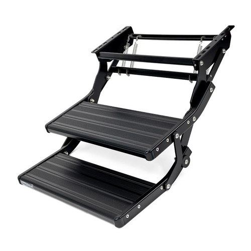 Aussie Traveller Black Manual Double Drop Down Step, 1 Year Warranty. The Aussie Traveller manual double step is designed for functionality, safety and style. Designed to be strong and reliable yet lightweight, this manual step features powder-coated steel brackets and aluminium, anti-slip treads with stainless steel springs and fixtures.