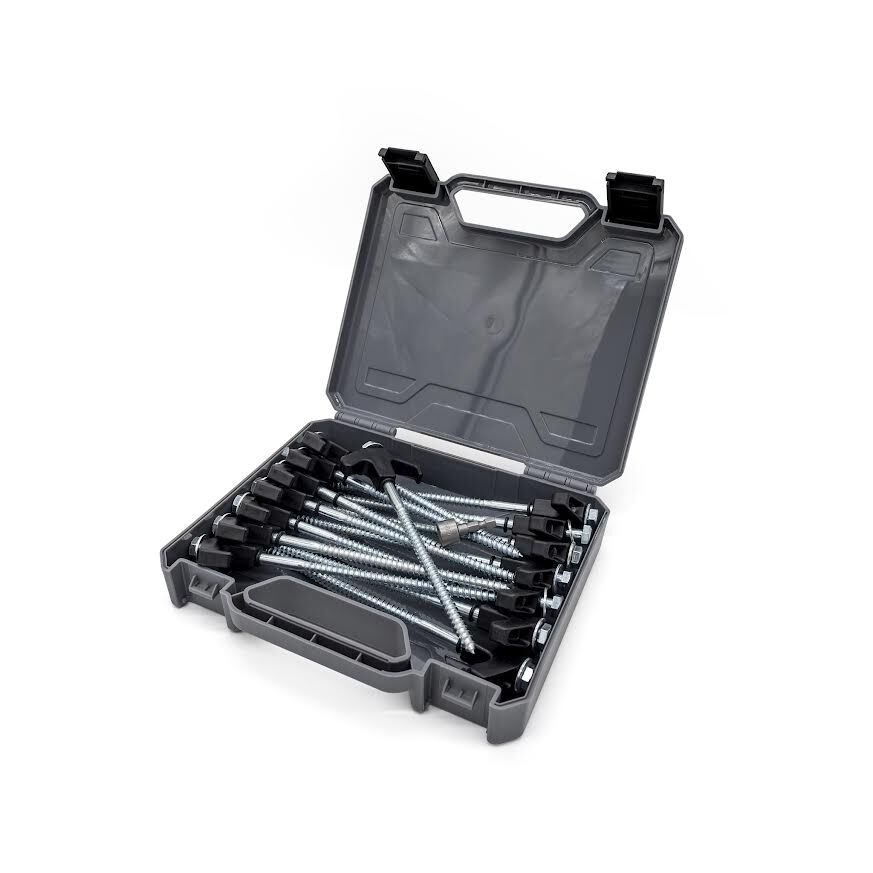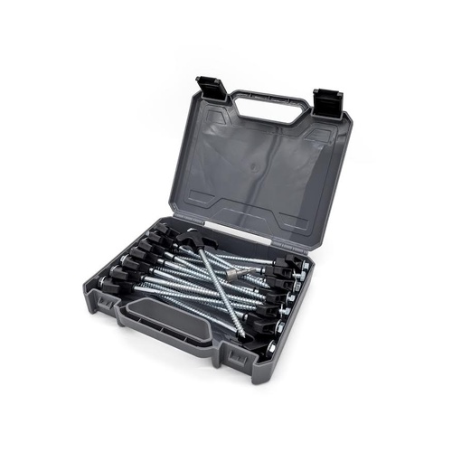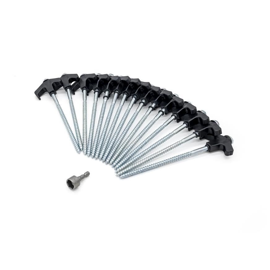Aussie Traveller Black Screw in Pegs 15PK, 1 Year Warranty. The Aussie Traveller galvanised screw in pegs are ideal for when the ground is too hard for your standard tent pegs. The set comes with 15 pegs along with a 13mm hex head socket that allows your drill to do all the hard work for you. If you don't have a drill, you can easily use these pegs with a shifter or a 13mm spanner, and you're good to go.