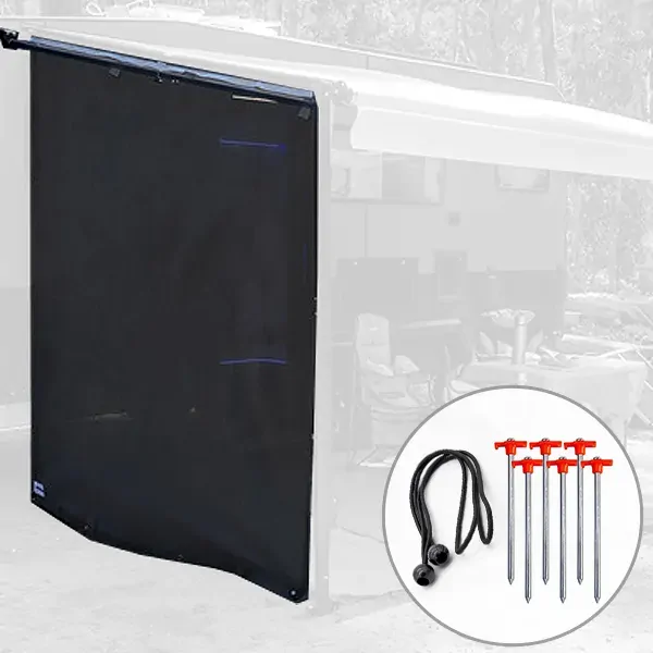 Aussie Traveller Black Sunblocker End Wall for Full Height Caravan, 1 Year Warranty. The Aussie Traveller Black Sunblocker End Wall will protect you and your family from the harsh Aussie sun. This ventilated partition is perfect for busy campgrounds providing a barrier between you and your neighbours while keeping your campsite cool and protected.