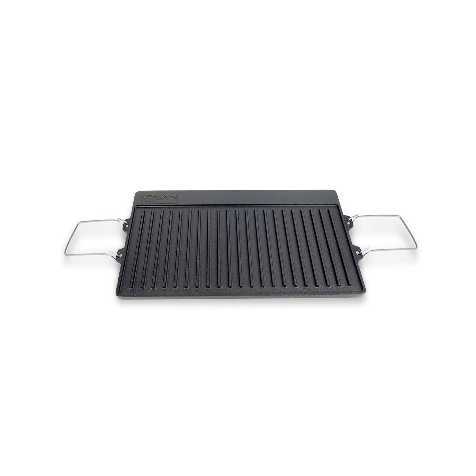 Aussie Traveller Cast Iron 2 Burner BBQ Plate, 1 Year Warranty. The Aussie Traveller Cast Iron cookware range is essential for cooking up a storm on the campfire. Cast Iron is a delight to cook with due to its superior heat retention and durability - better than steel or aluminium. This heavy-duty and practical cookware is made for cooking on coals, as it distributes heat evenly and maintains the heat, so you can get the best sear and perfect cook on any meats. For your benefit all our Cast Iron cookware also comes pre-seasoned, making it completely non-stick.