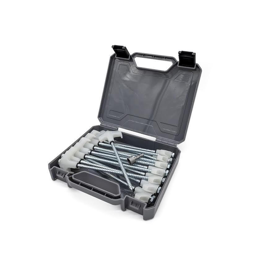 Aussie Traveller Lumo Screw in Pegs 15PK, 1 Year Warranty. The Aussie Traveller galvanised screw in pegs are ideal for when the ground is too hard for your standard tent pegs. The set comes with 15 pegs along with a 13mm hex head socket that allows your drill to do all the hard work for you. If you don't have a drill, you can easily use these pegs with a shifter or a 13mm spanner, and you're good to go.