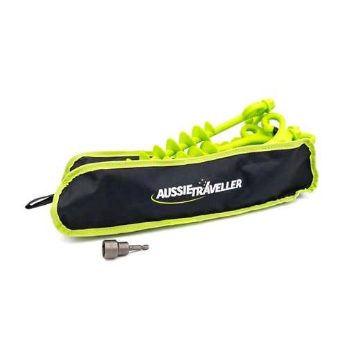 Aussie Traveller Screw In Sand Pegs 6 Pack, 1 Year Warranty. The Aussie Traveller Screw In Sand Pegs are a must have for every beach getaway. These sand pegs are made from tough fibre-reinforced nylon for ultimate strength and durability, ideal for securing tents, awnings, gazebos and beach shelters. Measuring 400mm long and finished in a fluoro green colour for easy visibility in the sand. This kit includes 6 Screw In Sand Pegs, 19mm hex head drill socket and a handy storage bag to put everything into.