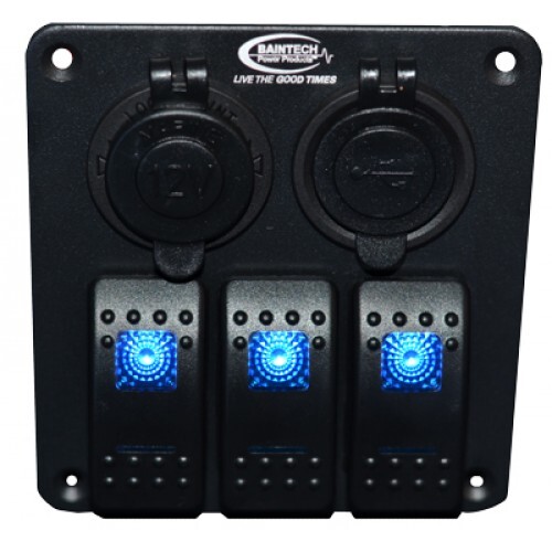 Baintech 12/24V LED 3 Way Switch Panel; with Ciga & USB Socket, 1 Year Warranty. Powering different devices when you're away in a 4WD can be a challenge. Switch panels offer a solution. Allowing easy access to power fridges, lights and all your devices. The Baintech blue LED 3 Way Switch Panel features a Ciga socket and Dual USB (4.2) + 3 customisable rocker switches. Pre-wired for easy installation, the Baintech range of switch panels are customisable, with rocker switch labels to suit your set up.