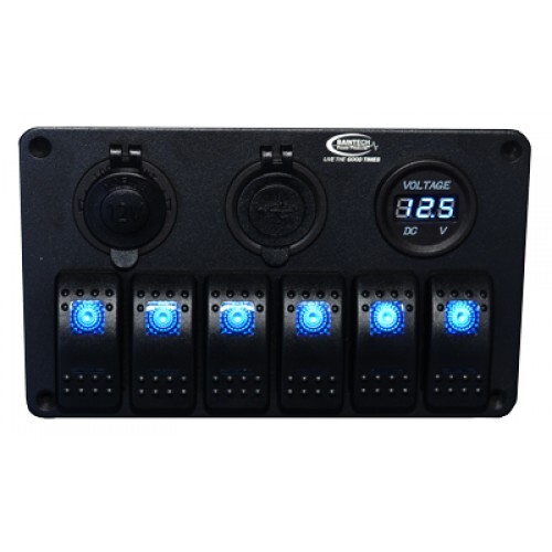 Baintech 12/24V LED 6 Way Rocker Switch Panel; with Volt Meter, Ciga & USB Socket, 1 Year Warranty. Powering different devices when you're away in a 4WD can be a challenge. Switch panels offer a solution. Allowing easy access to power fridges, lights and all your devices. The Baintech blue LED 6 Way Switch Panel features a Ciga socket, double 2.1a USB and Volt/Amp meter. Pre-wired for easy installation, the Baintech range of switch panels are customisable, with rocker switch labels to suit your set up. switch panel