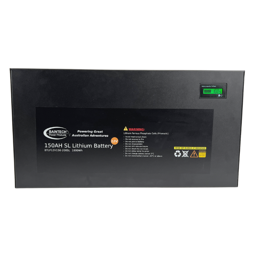 Baintech 12V 150Ah Deep Cycle Slimline Lithium Battery with 200Amp BMS, 5 Year Warranty. The 12V 150Ah Lithium Battery with 200ah BMS & digital display is perfect for powering your 12V set-up including up to 2000W inverter. This slimline lithium battery is strong and safe due to its aluminium casing and built-in BMS that protects you from temperature, over-voltage, and short circuit. Our unique BMS will further increase safety and durability. Can be connected in parallel for increase capacity, and connected in series for increase voltage Max 48V.