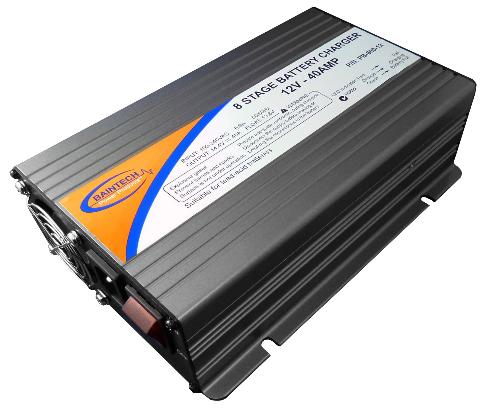 Baintech Battery Charger 12V 40A 1L 2 or 8 Stage adjustable - With temp sense, 2 year warranty. The Baintech battery chargers are robust Multi-stage Automatic microprocessor controlled battery chargers, with adjustable voltage.