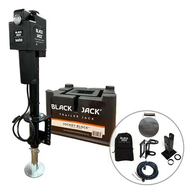 Black Jack MAXI Electric Trailer Jack Bundle with Harness kit & Jockey Block, 3 Year Warranty. The Black Jack Maxi is a quantum leap in technology and represents the new generation of Black Jacks. Incorporating an Intelli-Brake motor that automatically cuts power to the jack at either fully retracted or fully extended. Remote control operation allows for easier hitching and unhitching and makes levelling your caravan a breeze. The new Black Jack Maxi boasts a ball bearing worm drive that is twice as efficient, faster and quieter, and generates a massive lift capacity of 2,000kg. All Black Jack Maxi’s come with a Pre-installed Anderson plug for easy “Plug and Play” connection.