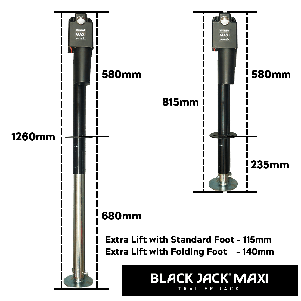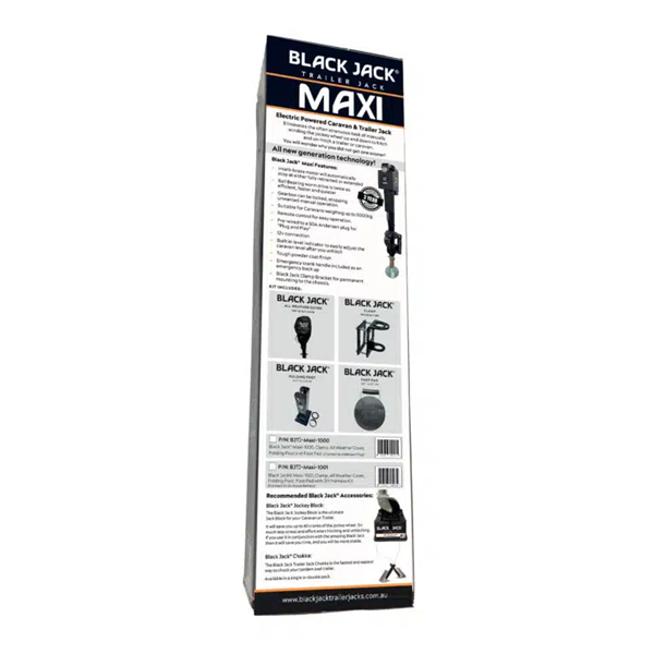 Black Jack MAXI Electric Trailer Jack with Clamp & Harness Kit, 3 Year Warranty. The new generation of electric trailer jack technology. The Black Jack Maxi is a quantum leap in technology and represents the new generation of Black Jacks. Incorporating an Intelli-Brake motor that automatically cuts power to the jack at either fully retracted or fully extended. Remote control operation allows for easier hitching and unhitching and makes levelling your caravan a breeze. The new Black Jack Maxi boasts a ball bearing worm drive that is twice as efficient, faster and quieter, and generates a massive lift capacity of 2,000kg. All Black Jack Maxi’s come with a Pre-installed Anderson plug for easy “Plug and Play” connection.