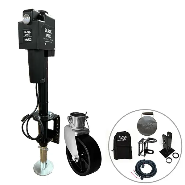Black Jack MAXI Electric Trailer Jack Bundle with Harness kit & Jockey Wheel, 3 Year Warranty. The new generation of electric trailer jack technology. The Black Jack Maxi is a quantum leap in technology and represents the new generation of Black Jacks. Incorporating an Intelli-Brake motor that automatically cuts power to the jack at either fully retracted or fully extended. Remote control operation allows for easier hitching and unhitching and makes levelling your caravan a breeze. The new Black Jack Maxi boasts a ball bearing worm drive that is twice as efficient, faster and quieter, and generates a massive lift capacity of 2,000kg. All Black Jack Maxi’s come with a Pre-installed Anderson plug for easy “Plug and Play” connection.