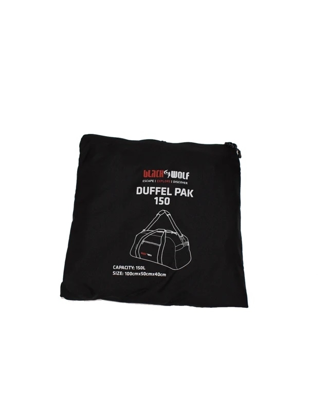 BlackWolf DuffelPack 150 Limited Lifetime Warranty. Available in four sizes and colours the Dufflepak is a great gear bag for any occasion and now packs away into it's own front pocket. Tough and durable 600D Polyester PU with fully lockable #10 zips. Such great value that you'll need more than one.