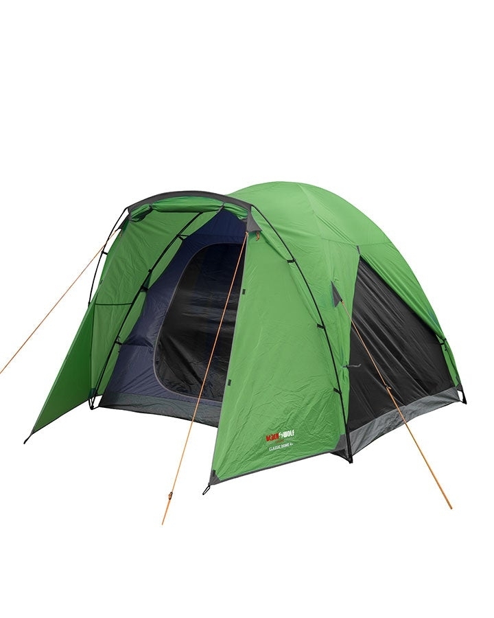 BlackWolf Green Classic 4 Person Dome Tent, 1 Year Warranty. Quick and easy to pitch, this versatile tent is perfect for weekend getaways or if you like to keep your camping trips simple. Generous internal head height, front vestibule for storage, full coverage Twilight Panels in the inner tent for early nights or sleeping in. Rear door access and roll away side vents for hot nights.