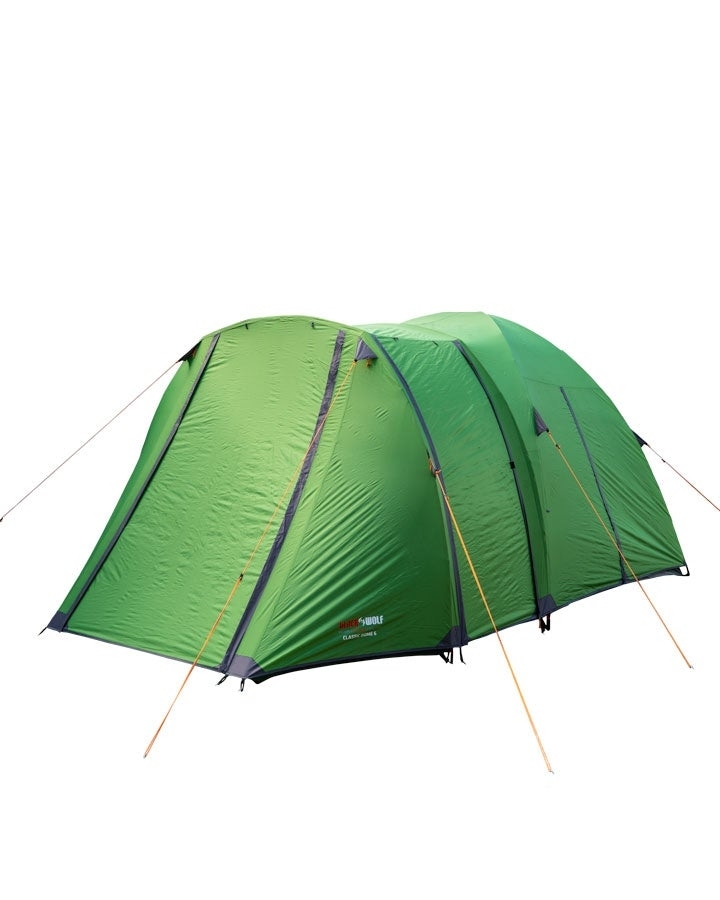 BlackWolf Green Classic 6 Person Dome Tent, 1 Year Warranty. A family sized dome tent, that is simple to pitch and super versatile. Inner tent can be divided into two rooms or used as one large space. Four doors and large side vents for lots of Summer ventilation but provides full coverage. Twilight Panels can be closed for early nights or extra winter warmth.