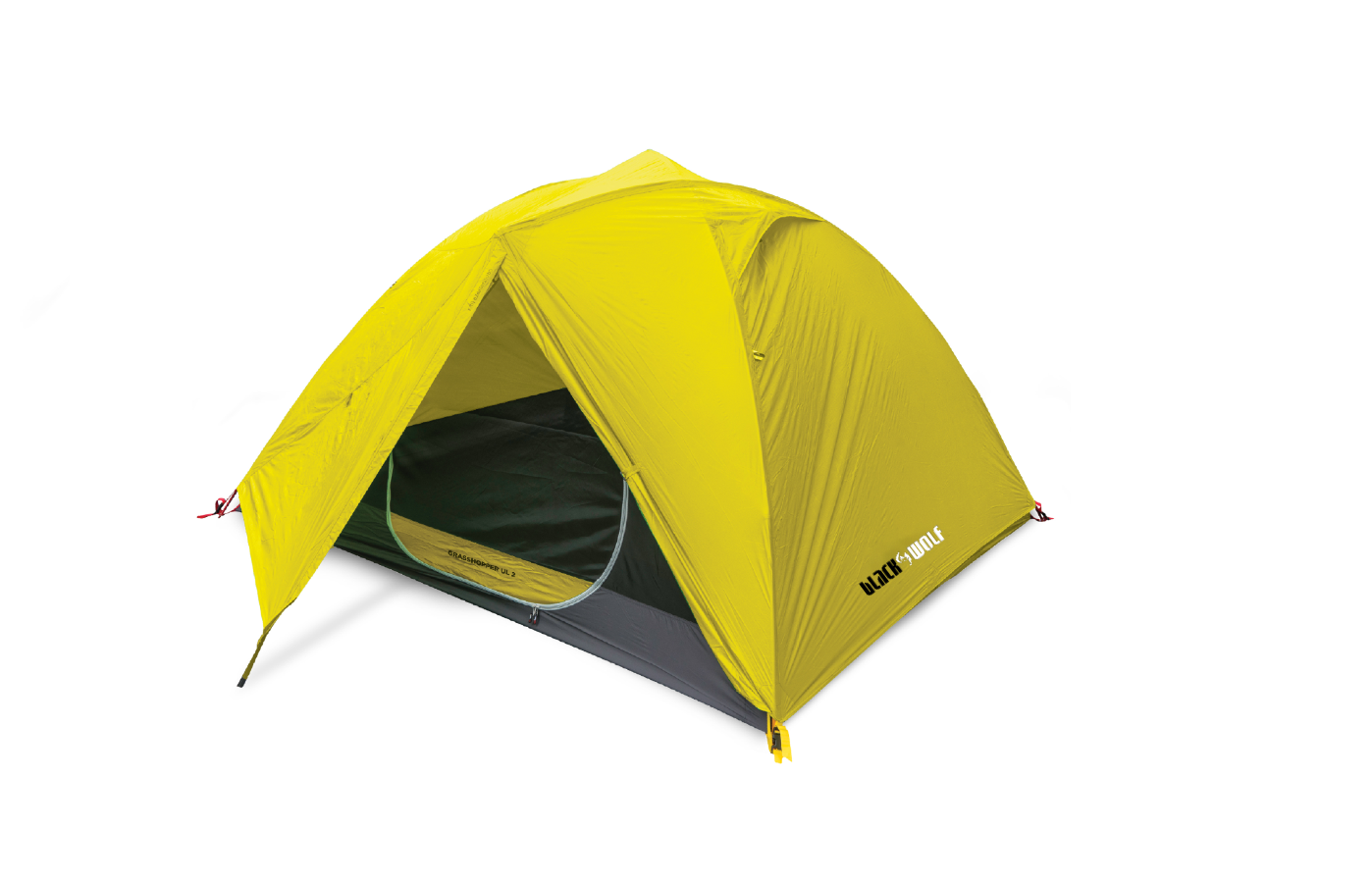 BlackWolf Vibrant Yellow Grasshopper 2 UL Tent, 1 Year Warranty. New lighter update of our popular Grasshopper 2 & 3 tents, the new Ultralight (UL) models have 40D Ripstop Sil-Nylon Flys and cord lock peg points. Grasshopper tents are lightweight and strong with great headroom. A full mesh inner and vestibules both sides offer excellent shelter for mild to moderate conditions.