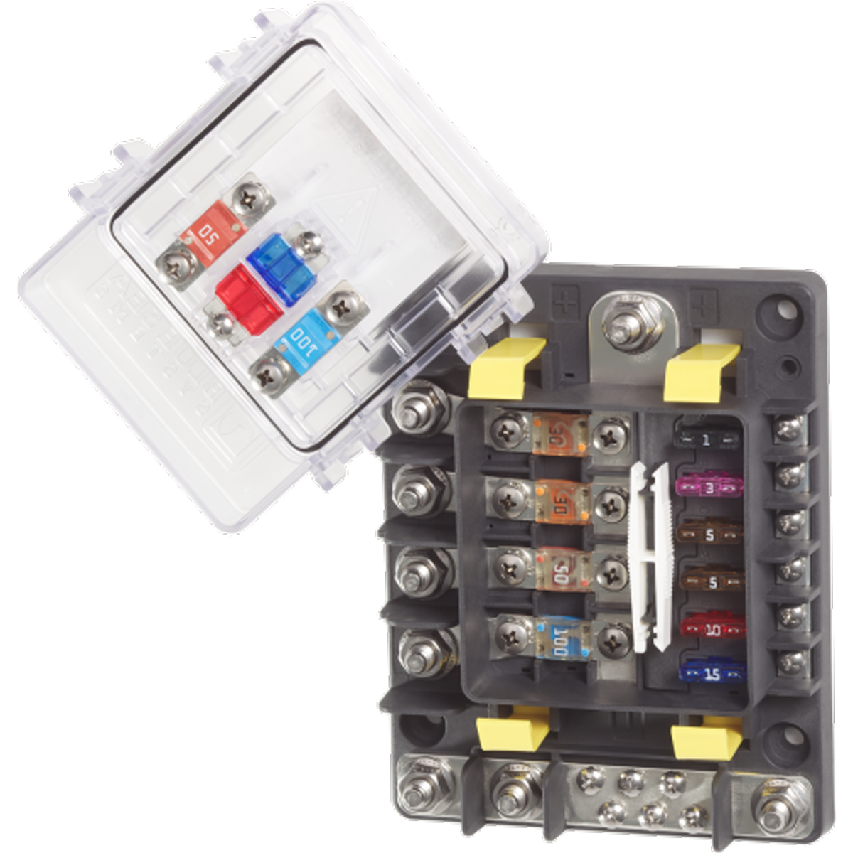 - Accepts six ATO® or ATC® Fuses for circuits up to 30A including bilge pumps, electronics and lights