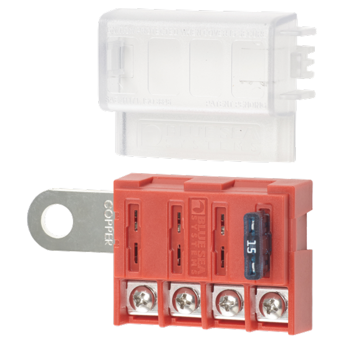 Blue Sea ST Blade Battery Terminal Mount Fuse Block 4 Circuits with Cover, 5 Year Warranty.