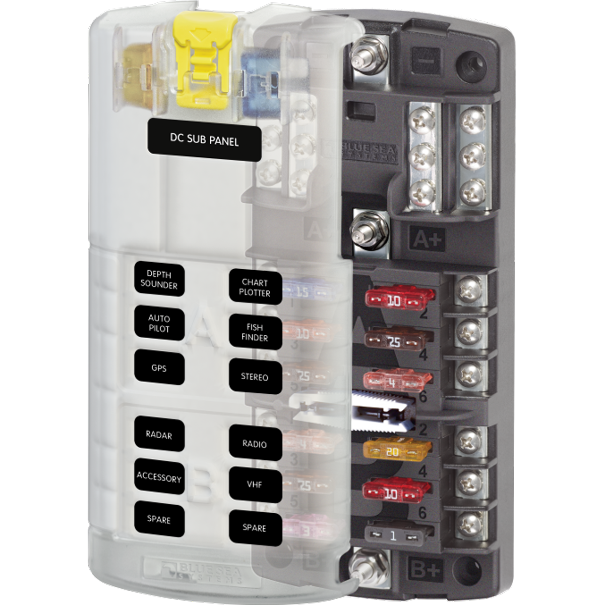 - Clear insulating cover with label recesses and storage for two fuses, satisfies ABYC/USCG insulation requirements