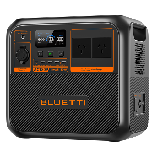 Bluetti AC180P 1440Wh Portable Solar Power Station, 5 Year Warranty. BLUETTI AC180P is a portable power station with pure sine wave inverter and LiFePO4 battery. As for recharging, AC180P takes up to 7440W AC input and 500W DC input. The fast charging feature ensures your machine remains on standby at all times.