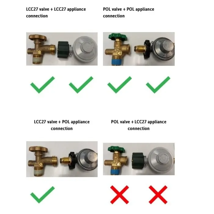 The new style hoses with the LCC27 Fitting can only be used with a matching cylinder, they are NOT compatible with POL Valve Cylinders.This may be impractical for some setups at this stage.While existing older style gas hoses with the POL fitting are compatible with the new LCC27 Valve Cylinders it is considered best practice to update to the new style when practical and existing hoses require replacing.