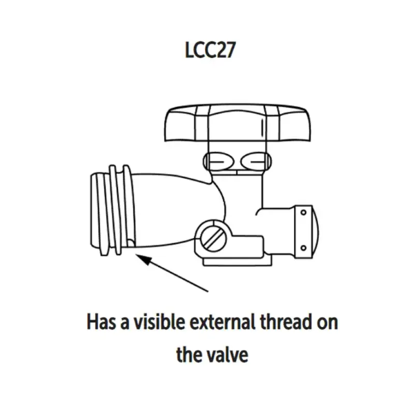 LCC27 is the acronym for the Leisure Cylinder Connection Type 27. It is an evolution of the current portable gas appliance Type 21 connection which is commonly referred to as a POL connection