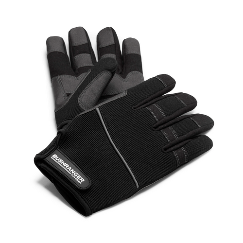 Bushranger Durable Recovery Gloves, 1 Year Warranty. Bushranger Recovery Gloves are built to keep you protected without making things difficult. Made from high-quality polyester with Kevlar-reinforced grip areas, these gloves provide protection against cuts and abrasions while still offering the dexterity needed to complete the task at hand. With elastic polyester for flexibility and Velcro cuffs to keep them snug, these one-size-fits-most gloves are comfortable and ready for anything.