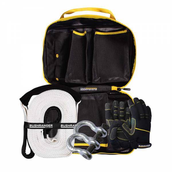 Bushranger Heavy Duty Snatch Kit, including 11,000kg Snatch Strap, Bow Shackles, gloves & bag, 5 Year Warranty. The Bushranger® Snatch Kit is a 4×4 essential for any driver. This Bushranger heavy-duty kit is a compact, durable bag with a 9m x 11,000kg snatch strap, 2 x 4.75t bow shackles and a pair of gloves. Take advantage of the extra pockets to store your other recovery gear.