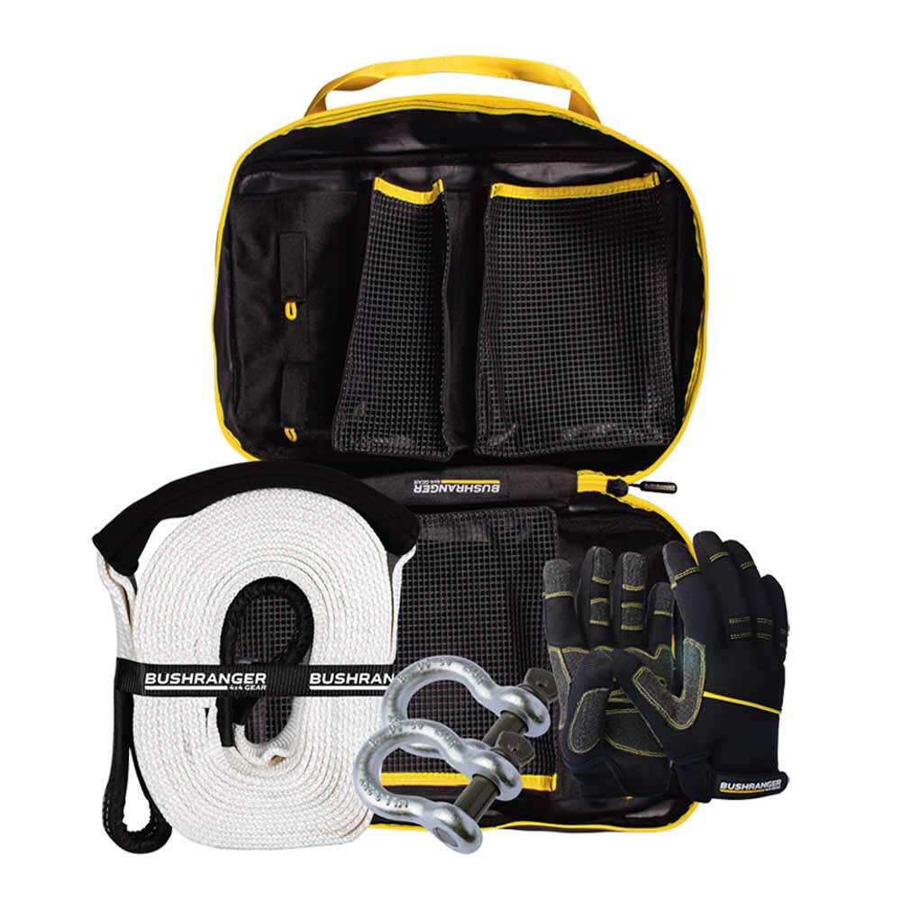 Bushranger Standard Snatch Kit, including 8,000kg Snatch Strap, Bow Shackles, gloves & bag, 5 Year Warranty. The Bushranger® Snatch Kit is a 4×4 essential for any driver. The Bushranger kit is a compact durable bag with a 9m x 8,000kg snatch strap, 2 x 3.25t bow shackles and a pair of gloves. Take advantage of the extra pockets to store your other recovery gear.