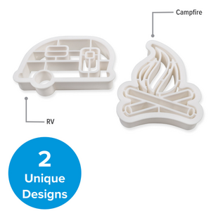 Camco Cookie Cutters. 53369, 1 Year Warranty. Camco's Life is Better at the Campsite Cookie Cutters are perfect for making decorative cookies. The pack includes (2) unique camp themed shapes that are great for RV enthusiasts. The RV-shaped cookie cutter measures 4-inches x 2 ¾-inches and the campfire cookie cutter measures 3-inches x 3 ¾-inches. They are made from food safe plastic.