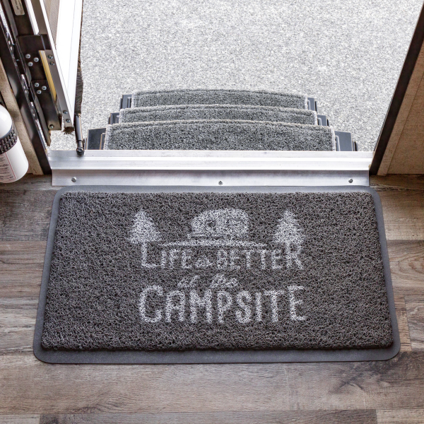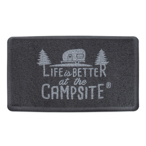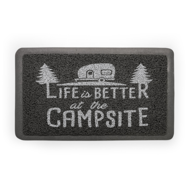 Camco Gray Scrub Rug. 53200, 1 Year Warranty. Stylish “Life Is Better at the Campsite” door mats are great for home, outdoors, under a pet bowl or camping! Use them to help trap dirt and debris to prevent bigger messes. Looped PVC material dries quickly, provides a cushioned step and is easy to clean. This mat comes in gray with a white "Life is Better at the Campsite" logo. It measures 26 1/2-inches x 15-inches.