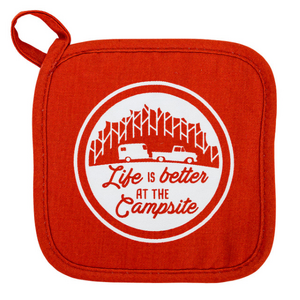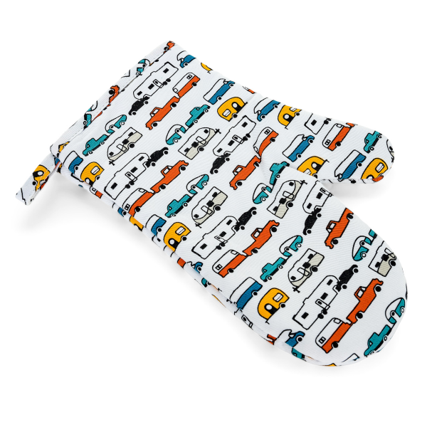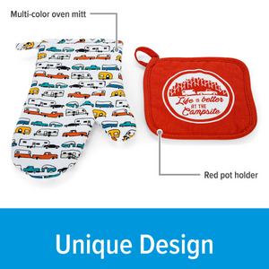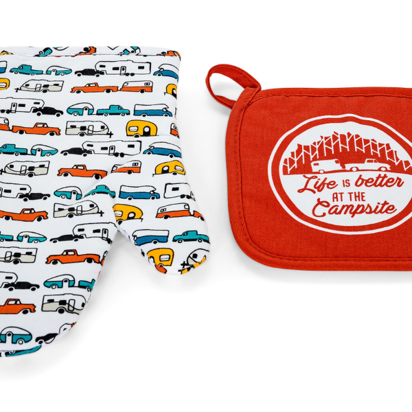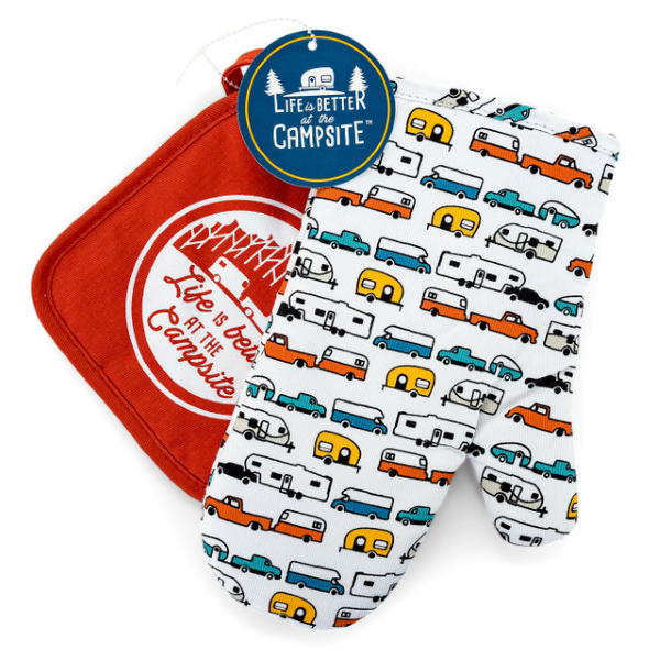 Camco Oven Mitt and Pot Holder. 53259, 1 Year Warranty. Camco’s Life is Better at the Campsite Oven Mitt and Pot Holder are heat resistant to protect your hands from hot foods, making them great for handling food from the oven, microwave or campfire. Ideal for RV enthusiasts, the mitt and pot holder feature a decorative RV camping-themed design—the mitt comes in multi-color; the pot holder in red. They are made out of 100% cotton.