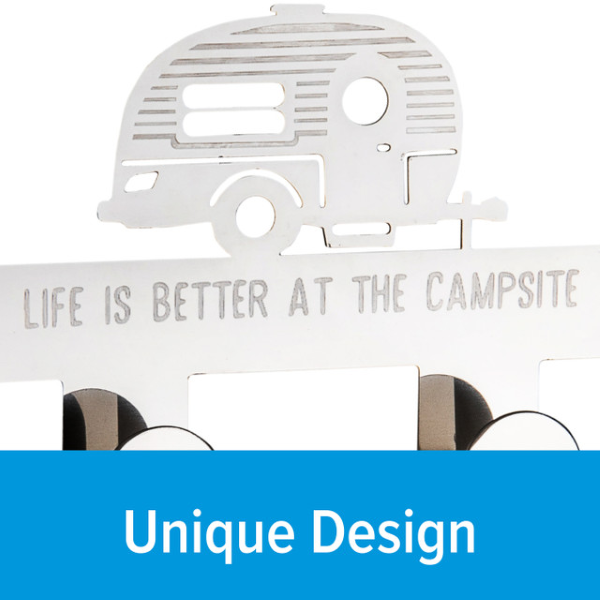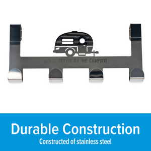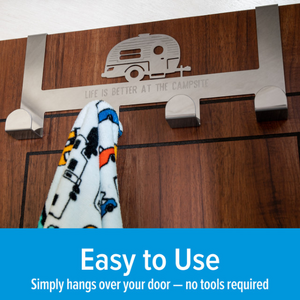 Camco Over the Door Towel Hanger - 4 Hooks. 53388, 1 Year Warranty. Camco's Life is Better at the Campsite Over the Door Towel Hanger provides (4) hooks for hanging towels, bathrobes, jackets, hats, scarves, purses and more. It is an ideal solution for small places—great for bedrooms, bathrooms and closets. The hanger fits standard interior doors up to 1 ½-inches thick. Easy to use, it simply hangs over your door—no tools required. Features a retro RV design with the phrase, "Life is Better at the Campsite". Constructed of durable stainless steel.