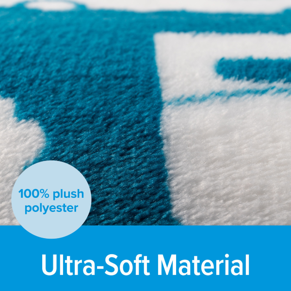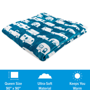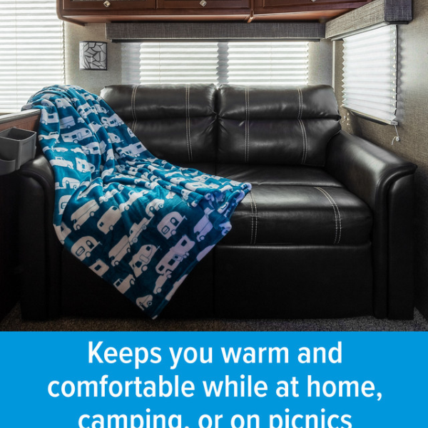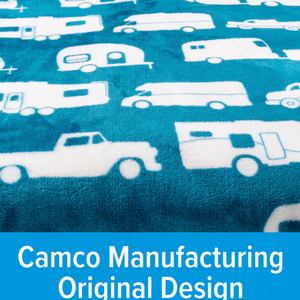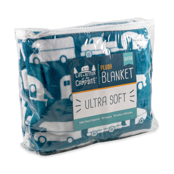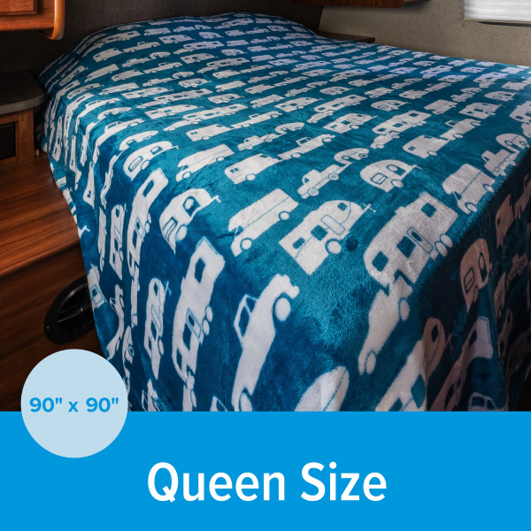 Camco Plush Queen Size Blue Fleece Blanket. 53440, 1 Year Warranty. Camco's Life is Better at the Campsite Plush Fleece Blanket helps keep you warm and comfortable while at home, camping or on picnics. This queen-sized blanket measures 90-inches (L) x 90-inches (W) and is made of 100% ultra-soft plush polyester. It is blue and features a Camco brand RV print. The blanket is machine washable for easy cleaning—see the care tag for details.