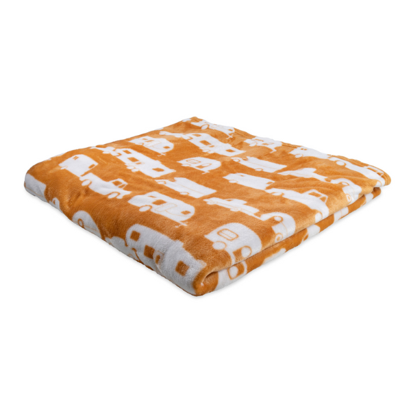 Camco Plush Queen Size Gold Fleece Blanket. 53441, 1 Year Warranty. Camco's Life is Better at the Campsite Plush Fleece Blanket helps keep you warm and comfortable while at home, camping or on picnics. This queen-sized blanket measures 90-inches (L) x 90-inches (W) and is made of 100% ultra-soft plush polyester. It is autumn gold colored and features a Camco brand RV print. The blanket is machine washable for easy cleaning—see the care tag for details.