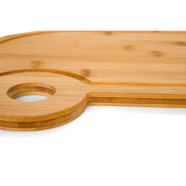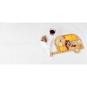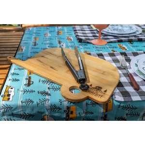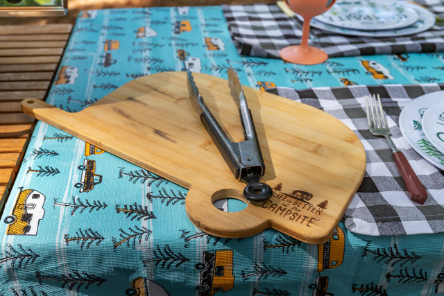 Camco Retro RV Bamboo Cutting Board. 53089, 1 Year Warranty. Camco’s Life is Better at the Campsite RV Shaped Bamboo Cutting Board is made of durable, premium quality bamboo construction. It is perfect for cutting vegetables, fruits, meats and cheese and its RV-shaped design also makes for a great decorating accessory for your kitchen. The cutting board won't damage or dull your knives. Bamboo features natural antibacterial properties and it resists moisture for easy maintenance.