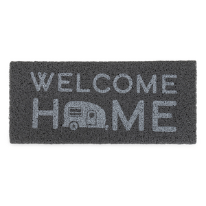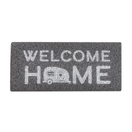 Camco RV Wrap Around Step Rug - Welcome Home - Gray / White. 53195, 1 Year Warranty. Camco's Life is Better at the Campsite RV Wrap Around Step Rug helps keep your RV clean by cutting down on tracked-in dirt. The rug is made of looped PVC material that dries quickly, provides a cushioned step and is easy to clean. The premium TPE backing helps keep the rug in place. It fits 23-inch wide steps and adjusts to fit RV steps with a depth of 8-inches to 11-inches. The step rug is compatible with manual and electric RV steps. To install, simply wrap the rug around your existing RV step and hook the springs into the grommets that fit the step. No screws, glue or tools are needed. Springs are unique in that the hook ends are turned back making installation easier. The mat is gray with a white "Welcome Home" retro RV print.