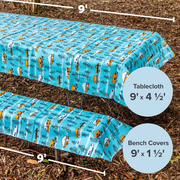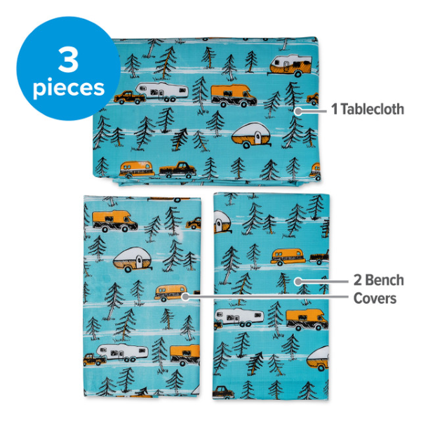 Camco Tablecloth with Bench Covers - RV and Tree Sketch Design. 53380, 1 Year Warranty. Camco's Life is Better at the Campsite Tablecloth with Bench Covers provide a clean eating and seating surface for camping, picnics and other outdoor activities.