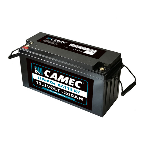 Camec 12V 200Ah Lithium Battery, 3 Years Warranty. CAMEC’s new LFP battery, now available in a 100Ah or 200Ah capacity. LFP batteries offers many advantages in comparison to a sealed lead acid (SLA) battery such as a longer cycle life, lightweight, higher charging efficiency and shorter charging time.