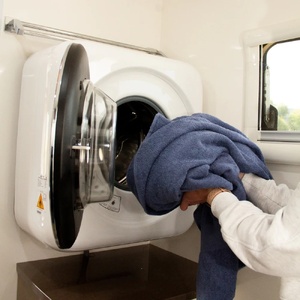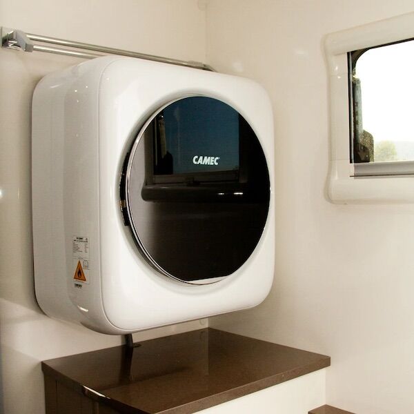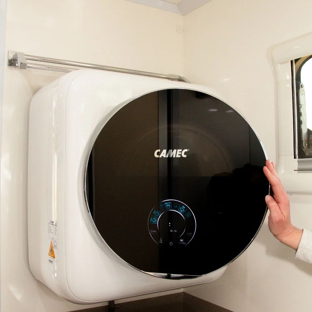 Camec 2.5kg Wall Mount RV Washing Machine, 1 Year Warranty. CAMEC’s next generation COMPACT RV 2.5kg wall mounted washing machine has arrived. Featuring an updated exterior look with a gloss white finish, a gloss black door with silver accents and a new LED control panel. The new model has a 2.5 star energy rating combined with a 3.5 star WELS (Water Efficiency) rating. Specifically designed for Australia’s harsh conditions, it’s perfectly suited for all caravan and RV installations.