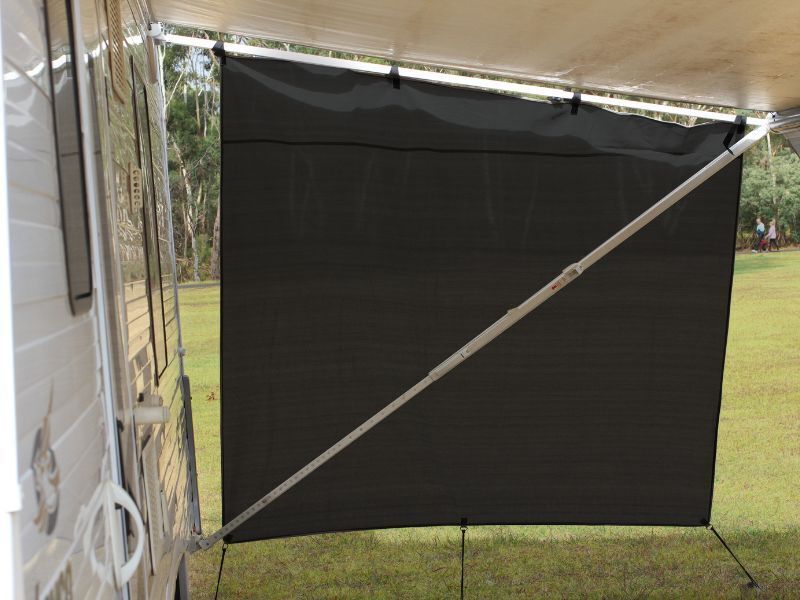 The Camec Privacy Screen end wall attaches to Roll-Out Awnings with 4 velcro & loop tabs securing to the upper arm brace of the roll out awning. The screens come in black which will pair nicely with any awning vinyl colour.