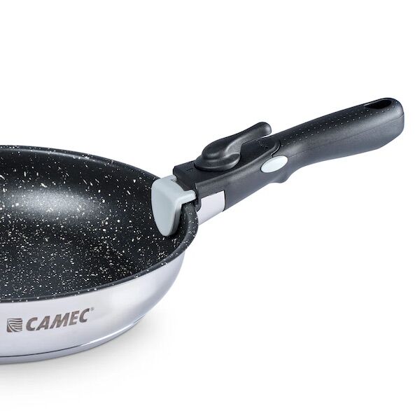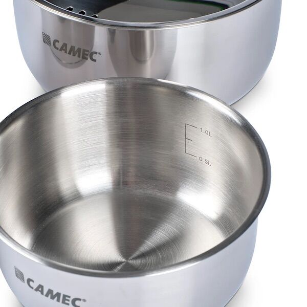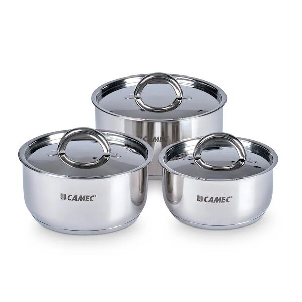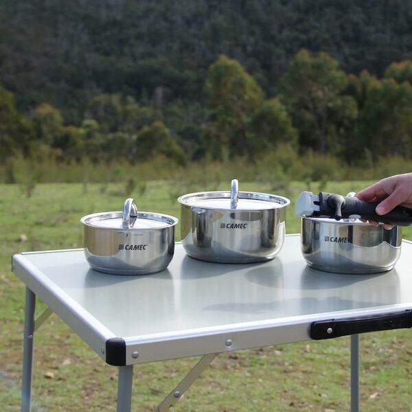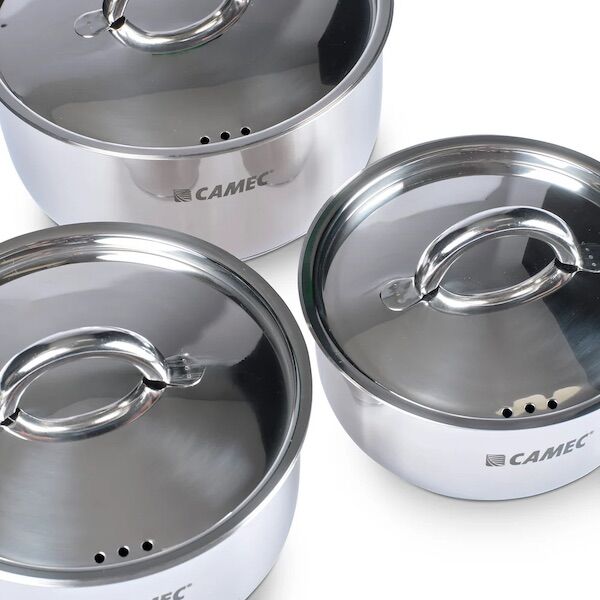Camec Spacesaver Pots & Pan, 1 Year Warranty. When you travel, storage is something everyone takes into account, Camec’s new range ofstainless steel pots are a huge space saver for caravaners and campers alike. Featuring threestainless steel pots, and a nonstick stainless steel fry-pan. When you travel, storage is something everyone takes into account, Camec’s new range ofstainless steel pots are a huge space saver for caravaners and campers alike. Featuring threestainless steel pots, and a nonstick stainless steel fry-pan.